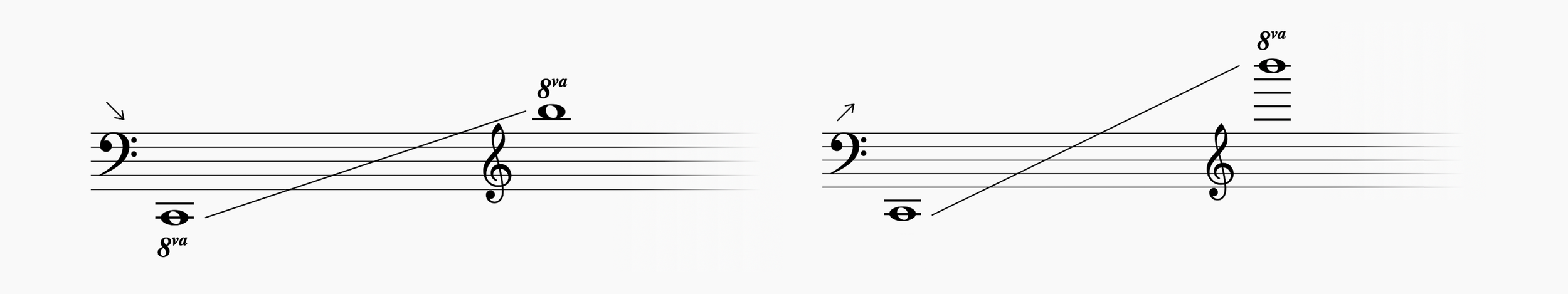 The octave range of the ondes is usually controlled using a lever just below the keyboard. On a score for the ondes, the lower position is dictated by an arrow pointing down and to the right, and the upper position is indicated by an arrow pointing up and to the right. The ondes can cover a very large range, as you can see!